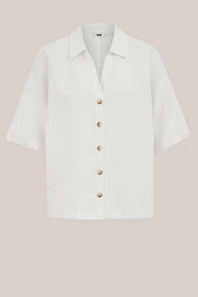 Een luchtig item voor elke warme dag. Deze blouse van linnenmix heeft een regular fit, een kraag, V-hals, knoopsluiting, korte mouwen en een korte lengte.