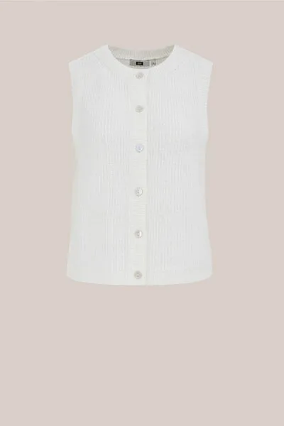 Het perfecte extra laagje. Dit gebreide gilet met ronde hals en knopen geeft elke outfit die zachte, vrouwelijke touch. Draag 'm als top of over een blouse – de fijne stof en fit maken ‘m perfect voor eindeloos combineren.