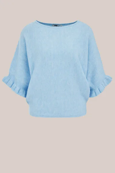 Zacht, vrouwelijk en moeiteloos stijlvol. Deze gebreide trui heeft een regular fit, een elegante boothals en korte mouwen met een ruffleboord voor een subtiele, speelse touch.
