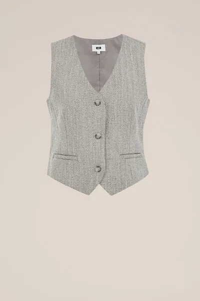 Zegt: ik heb het onder controle – ook als je doet alsof. Dit gilet met visgraatpatroon heeft een slim fit, een V-hals, een knoopsluiting en twee paspelzakken voor kleine kantoorbenodigdheden. Laat zien wie de baas is, ook zonder mouwen.