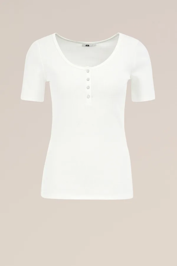 Voor onder alles – of gewoon op zichzelf. Dit nauwsluitende T-shirt met korte mouwen en een subtiele halve knoopsluiting past zich moeiteloos aan elke dag en elke stijl aan.