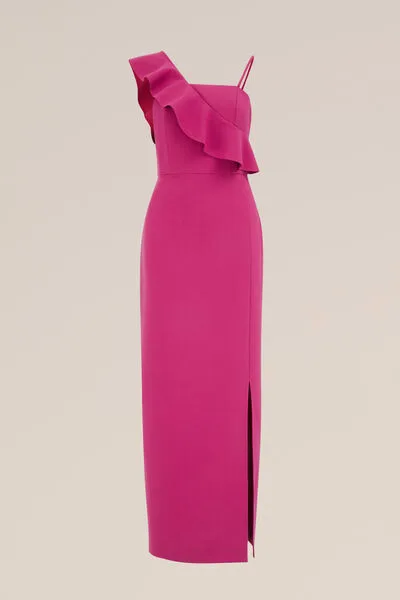 Een echte showstopper. Deze one-shoulder jurk heeft ruches en een verstelbaar bandje over de schouder. Het split aan de zijkant en de baleinen in het bovenstuk zorgen voor een flatterend silhouet. Een echte blikkenvanger voor je garderobe!