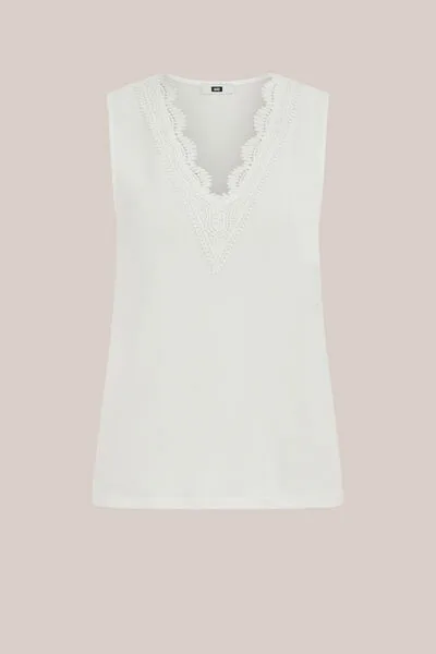 Vrouwelijk, verfijnd en verrassend veelzijdig. Dit mouwloze singlet met aansluitende fit en borduursel langs de halslijn geeft elke outfit een elegante upgrade – los of als onderlaag.