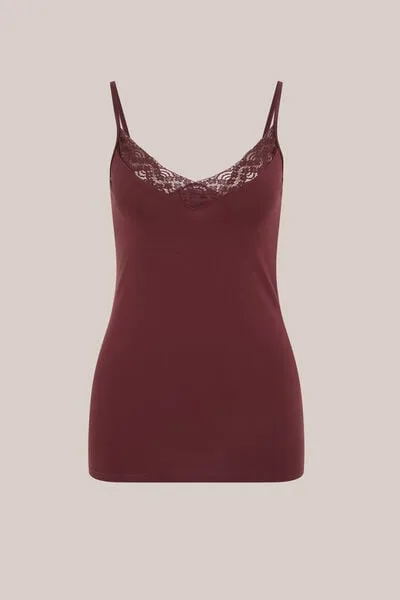 Omarm het ultieme comfort in stijl. Dit nauwsluitende singlet van jersey-kwaliteit met stretch biedt een vleugje luxe met een kanten V-hals en verstelbare spaghettibandjes. Elke outfit wordt afgemaakt met deze elegante touch-up.