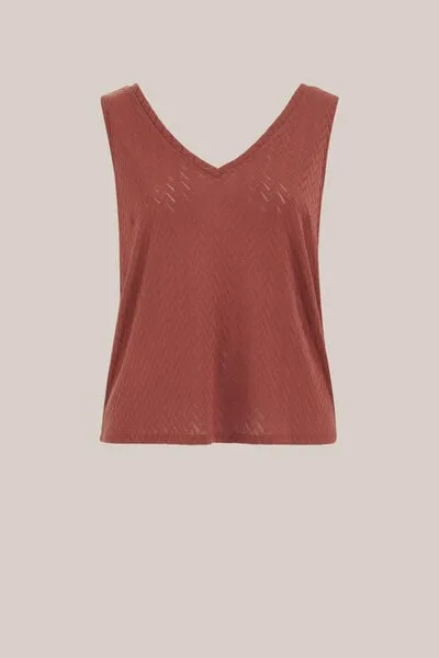 Verfijnd geweven en lekker luchtig. Dit singlet heeft een regular fit, een V-hals en een opengewerkt zigzagpatroon dat zorgt voor een elegante en zomerse uitstraling.