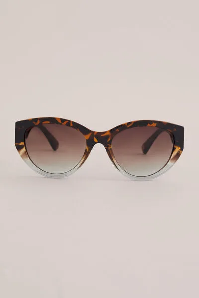 Kat in ’t stijlvolle bakkie. Deze zonnebril komt in twee varianten: donkerbruin gevlekt met groene glazen of bruin-naar-transparant met lichtbruine glazen. Volledig polycarbonaat met UVA/UVB-bescherming en microfiber hoesje.