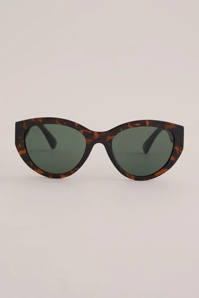 Kat in ’t stijlvolle bakkie. Deze zonnebril komt in twee varianten: donkerbruin gevlekt met groene glazen of bruin-naar-transparant met lichtbruine glazen. Volledig polycarbonaat met UVA/UVB-bescherming en microfiber hoesje.