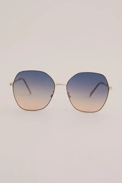 Glam zonder moeite. Deze zonnebril heeft een metalen frame met grote glazen, neuspads en metalen pootjes, in roségoud met donkerrood of goud met blauw-roze verloop. Biedt UVA/UVB-bescherming en wordt geleverd met een microfiber hoesje.