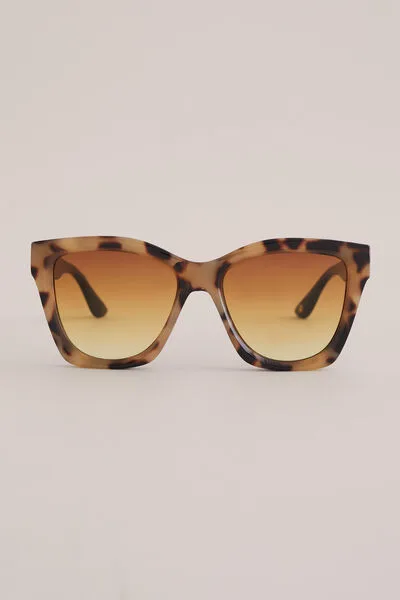 Een leukere cat-eye vinden? Maak dat de kat wijs. Deze zonnebril heeft een groot cat-eye montuur met lichtbruine-naar-gele glazen en donkerbruine spikkels op het frame. Volledig polycarbonaat met UVA/UVB-bescherming en een microfiber hoesje erbij.