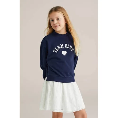 Deze donkerblauw-witte WE Fashion jurk voor meisjes combineert het comfort van een sweater met de zwier van een rok. Ideaal voor dagen waarop spelen en er verzorgd uitzien gewoon samen mogen gaan. Het bovenstuk is gemaakt van zachte sweaterstof met een ronde hals en lange mouwen, terwijl de rok een kanten bovenlaag heeft met daaronder een katoenen onderrok. Elke uitvoering heeft een eigen print of borduursel op het voorpand, wat zorgt voor een speelse, girly uitstraling.Comfort en details voor elke dag Regular fit sweatjurk met bovenstuk van sweaterstof Lange rechte mouwen met ribboord voor een fijne pasvorm Rokgedeelte met kanten bovenlaag en katoenen onderrok Geen sluiting, zodat de jurk makkelijk aan en uit gaat Donkerblauw/witte kleur met meerkleurige print of tekst op het voorpand Sweatergedeelte gemaakt van 83% katoen en 17% polyester Rokgedeelte gemaakt van 98% nylon en 2% elastaan voor subtiele rekSpeelse jurk voor school, feest en thuisDe lengte van de rok is kort en vrolijk, waardoor deze jurk heel geschikt is voor schooldagen, een feestje of een dag thuis. De sweaterlook boven en de kanten rok onder geven samen een speels contrast. Combineer met een legging of maillot en sneakers of laarsjes voor een complete outfit.WE Fashion voor het hele gezinWE Fashion staat bekend om moderne kleding voor het hele gezin, met aandacht voor draagcomfort en toegankelijke stijl. De ontwerpen sluiten aan op de laatste trends, maar blijven praktisch voor alledaags gebruik. Zo kies je voor kinderkleding die er verzorgd uitziet en prettig draagt, dag na dag.Een vrolijke sweatjurk waarmee elke dag net even specialer aanvoelt.