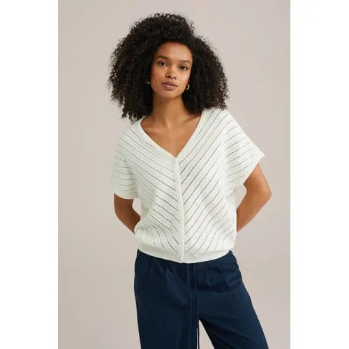 Dit damesvest van WE Fashion is vervaardigd uit 100% katoen. Het is voorzien van een knoopsluiting en een V-hals. Het vest heeft korte mouwen en geen zakken, wat het perfect maakt voor een frisse uitstraling.