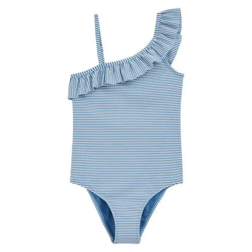 Speels en comfortabel zwemmen wordt eenvoudig met dit WE Fashion badpak voor meisjes. Het model heeft een regular fit en valt soepel langs het lichaam. De schuine halslijn geeft een moderne, asymmetrische look. Aan de linkerkant lopen sierlijke ruches langs de boord en rechts zorgt een dun, verstelbaar schouderbandje voor een goede pasvorm. De seersucker structuur en fijne streepprint maken het badpak extra levendig.Details die het verschil maken Regular fit voor een comfortabele, niet te strakke pasvorm Schuine halslijn met ruches aan de linkerkant voor een speelse uitstraling Dun, verstelbaar schouderbandje rechts voor een beter aansluitende pasvorm Met seersucker structuur en fijne streepprint voor een levendig oppervlak Gemaakt van drieënvijftig procent polyester, drieënveertig procent polyamide en vier procent elastaan voor vormvastheid en stretch Geschikt voor peuters, kleuters, schoolkinderen en tieners Handwas, niet strijken en niet drogen in de droogtrommelVoor stranddagen en zwemlessenDit badpak is een praktische keuze voor zwemles, een dagje zwembad of vakantie aan zee. De stof sluit goed aan zonder te knellen. Door het verstelbare bandje kan het badpak worden aangepast naarmate het kind groeit, zodat het langer goed blijft zitten tijdens het spelen en zwemmen.WE Fashion voor alledaagse kinderkledingWE Fashion biedt moderne, makkelijk te combineren kleding voor elke dag. De kinderlijn sluit aan bij een actieve levensstijl, met modellen die rekening houden met beweging en draaggemak. Zo ontstaat zwemkleding met een comfortabele pasvorm, die er verzorgd uitziet en geschikt is voor regelmatig gebruik.Een stijlvol en praktisch badpak waar zij volop in kan zwemmen en spelen.