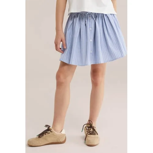 Speelse strepen en veel bewegingsvrijheid komen samen in deze korte A-lijn meisjes rok met streepprint. De rok heeft een regular fit, een elastische tailleband met koord en een uitlopende pasvorm. De streepprint in de kleur Morning Mist geeft een frisse, moderne uitstraling die makkelijk combineert met T-shirts, tops en truien voor elke dag.Handige details voor actieve dagen Elastische tailleband met koord voor een comfortabele, aansluitende pasvorm Uitlopende A-lijn rok die soepel meebeweegt Verborgen binnenbroekje voor extra zekerheid tijdens rennen en spelen Decoratieve knoopsluiting aan de voorkant voor een verzorgd geheel Gemaakt van katoen, met een zachte touch op de huid Streepprint in de kleur Morning Mist, eenvoudig te combineren Geen zakken, waardoor de rok mooi in model blijftIdeaal voor school, speelafspraken en vrije tijdDeze rok past goed in de dagelijkse garderobe van peuters, kleuters, schoolkinderen en tieners. Het binnenbroekje geeft een gerust gevoel bij klimmen op het klimrek, fietsen of een spelletje op het schoolplein. Met sneakers en een basic T-shirt ontstaat snel een complete outfit.Vertrouwde stijl van WE FashionWE Fashion staat bekend om kinderkleding die er verzorgd uitziet en tegelijk praktisch is in het dagelijks leven. Met oog voor pasvorm, draagcomfort en moderne details maakt het merk kleding die makkelijk combineerbaar is en vaak uit de kast wordt gepakt.Een frisse rok die elke dag weer klaarhangt voor school, weekend en vakantie.