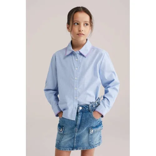 Deze WE Fashion meisjes blouse is een veelzijdig kledingstuk dat vaak uit de kast gepakt kan worden. De blauwe streepprint geeft een frisse, tijdloze uitstraling, terwijl de decoratieve borduurstiksels langs de kraag en mouwboorden voor een subtiel accent zorgen. Door de regular fit biedt de blouse bewegingsvrijheid en draagt deze prettig op drukke schooldagen, feestjes en alles daartussenin.Verfijnde details voor elke dag Regular fit voor een comfortabele pasvorm met voldoende bewegingsvrijheid Klassieke kraag en knoopsluiting aan de voorzijde voor een nette, verzorgde look Lange, rechte mouwen met enkele knoopsluiting bij de manchetten Blauwe streepprint gecombineerd met subtiele borduurstiksels langs kraag en mouwboorden Gemaakt van 75% katoen en 25% polyester voor een soepele stof die prettig aanvoelt Verpakking met één blouse, goed te combineren met jeans, rok of nette broekVeelzijdig van school tot familiefeestDeze blouse past bij zowel een gewone schooldag als een speciale gelegenheid. In combinatie met een spijkerbroek ontstaat een casual outfit, met een nette broek krijgt de look een meer geklede uitstraling. De gestreepte print en de borduurdetails maken de blouse geschikt voor verschillende momenten.WE Fashion, vertrouwd en eigentijdsWE Fashion richt zich op moderne, draagbare mode voor het hele gezin. De collecties sluiten aan op actuele trends en houden rekening met praktisch gebruik en draagcomfort. Zo kies je voor kleding die in het dagelijks leven goed van pas komt.Een praktische basisblouse met een opvallend detail die moeiteloos aansluit bij drukke, gezellige dagen.