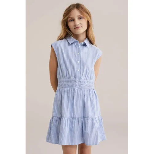 Licht, luchtig en helemaal klaar voor zonnige dagen, deze meisjes jurk is ideaal voor school, speeltuin of een dagje weg. Het mouwloze model met klassieke kraag en knoopsluiting aan de voorkant geeft een nette, maar toch speelse uitstraling. De lichtblauwe kleur met ingeweven streepprint zorgt voor een frisse look die makkelijk te combineren is met sandalen, sneakers of een vestje.Fris model met slimme details Mouwloos ontwerp met klassieke kraag voor een luchtig en toch verzorgd silhouet Knoopsluiting aan de voorkant waardoor aan- en uittrekken eenvoudig gaat Gesmokte taille voor een comfortabele pasvorm die mooi mee beweegt Lichtblauwe kleur met fijne streepprint voor een frisse, zomerse uitstraling Gemaakt van een katoenrijke stof die zacht aanvoelt op de huid Blousejurk lengte die boven de knie valt, prettig voor dagelijks gebruikElke dag draagbaarDeze jurk past goed in de dagelijkse garderobe. Op een warme schooldag draag je hem gewoon zo, met sandalen of gympen. Op frissere dagen is hij makkelijk te combineren met een legging en een vest, zodat hij het hele seizoen door gedragen kan worden.Stijl van WE FashionWE Fashion staat bekend om moderne, toegankelijke stijlen voor het hele gezin. De collecties voor kinderen zijn ontworpen met aandacht voor draaggemak, pasvorm en eigentijdse details. Zo kun je rekenen op kleding die prettig zit en er verzorgd uitziet, keer op keer.Een fijne, lichte keuze voor iedere dag van de week.