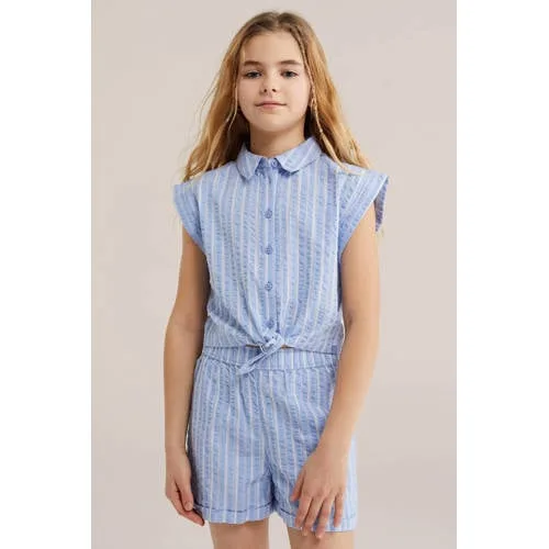 Luchtig, speels en klaar voor zonnige dagen: deze lichtblauwe meisjes seersucker top van 100% katoen is ideaal voor school, vakantie of een dag in de tuin. De mouwloze blouse heeft een klassieke kraag en knoopsluiting aan de voorkant, waardoor hij net wat gekleder oogt dan een gewoon T-shirt. De grove seersuckerstructuur geeft een speels reliëf en voelt licht aan op de huid, ook op warme dagen.Luchtige details voor elke dag Gemaakt van 100% katoen, prettig ademend en fijn voor de gevoelige kinderhuid Mouwloos model voor extra bewegingsvrijheid en verkoeling Klassieke kraag en volledige knoopsluiting voor een nette, maar toch speelse look Verticale streepprint in lichtblauw, waardoor de top fris en zomers oogt Strikdetail aan de onderkant voor een verstelbare, speelse zoom Grove seersuckerstructuur met duidelijke textuur voor een luchtig draaggevoel Geschikt voor peuter en kleuter, schoolkind en tiener binnen de Daily collectieGemakkelijk te combineren op zonnige dagenDeze lichtblauwe top combineer je eenvoudig met een korte broek, rok of jeans. Draag hem gesloten voor een nette uitstraling of laat het bovenste knoopje open voor een relaxte look. Ideaal voor warme schooldagen, een dagje weg of gewoon om in te spelen.Vertrouwde stijl van WE FashionWE Fashion biedt kinderkleding die er verzorgd uitziet en tegelijkertijd praktisch in gebruik is. De ontwerpen sluiten aan op het dagelijkse leven van kinderen, met materialen die prettig aanvoelen en pasvormen die ruimte geven om te bewegen en te spelen.Een luchtige top voor zonnige dagen, waarin je kind zich vrij kan bewegen en er toch verzorgd uitziet.