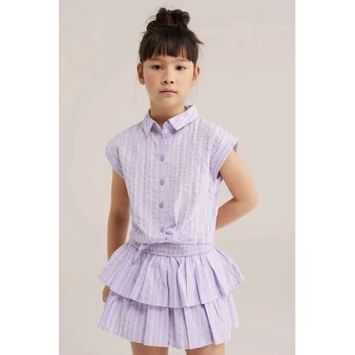 Luchtig, vrolijk en klaar voor zonnige dagen, deze mouwloze meisjes top van WE Fashion is een fijne basic met een speelse twist. De blouse heeft een klassieke kraag en knoopsluiting, waardoor hij net even gekleder oogt, terwijl de grove seersuckerstructuur juist een relaxte uitstraling geeft. De verticale streepprint in de kleur viola en het strikdetail aan de onderkant zorgen voor een frisse, zomerse look.Frisse details voor iedere dag Mouwloze blouse met klassieke kraag en knoopsluiting aan de voorzijde Grove seersuckerstructuur voor een luchtige, licht reliëfachtige touch Verticale streepprint die optisch verlengt en speels oogt Strikdetail onderaan de zoom voor een vrolijk accent Gemaakt van katoen, zacht en comfortabel voor de huid Geschikt voor peuter en kleuter, schoolkind en tiener Geen zakken, waardoor de top mooi glad langs het lichaam valtIdeaal voor zonnige dagenDeze top past makkelijk in de dagelijkse garderobe. Combineer met een korte broek of een luchtig rokje op warme dagen, of draag hem met een jeans en sneakers naar school. Door de mouwloze vorm en het lichte materiaal voelt hij prettig aan, ook als het buiten warm is.WE Fashion voor kidsWE Fashion staat voor eigentijdse kleding met een doordachte pasvorm, ook voor kinderen. De collecties zijn afgestemd op het dagelijks leven, zodat items comfortabel zitten en tegelijk verzorgd ogen. Zo kies je voor kleding waar je kind zich vrij in kan bewegen en die er de hele dag netjes uit blijft zien.Een vrolijke zomertop die makkelijk te combineren is en snel een favoriet in de kast wordt.
