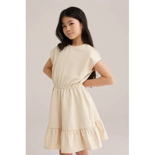 Deze beige meisjes jurk met seersucker strepen is een praktische basic voor elke dag. De luchtige stof met subtiel reliëf en verticale strepen geeft direct een rustige, verzorgde uitstraling. De jurk heeft een regular fit, een ronde hals en kapmouwtjes, waardoor hij comfortabel zit en toch netjes oogt. In de taille zit elastiek voor een mooie, speelse vorm en onderaan zorgt de volant voor extra beweging bij elke stap.Praktische details voor elke dag Regular fit met ronde hals voor een comfortabele, vertrouwde pasvorm Kapmouwtjes bieden net wat extra bedekking aan de schouders Elastiek in de taille voor een vrouwelijke, blousende look Volant aan de onderkant voor een zwierige afwerking Seersucker stof met verticale strepen en een lichte stretch Knoopsluiting achterop maakt aan- en uittrekken eenvoudig Korte jurk, ideaal voor school, verjaardag of familiebezoek Geen zakken voor een gladde, nette uitstralingVoor peuter, kleuter, schoolkind en tienerDeze jurk komt uit de Daily collectie en is ontworpen om vaak te dragen. Door de rustige beige kleur combineer je hem makkelijk met sandalen, sneakers of een fijn vest. De jurk is beschikbaar voor verschillende leeftijden, van peuter en kleuter tot schoolkind en tiener, zodat hij aansluit op de fase waarin je kind zit.WE Fashion voor kidsWE Fashion staat bekend om eigentijdse kleding met aandacht voor pasvorm en draaggemak. De kinderlijnen sluiten aan bij de dagelijkse momenten, van school tot weekend. Met deze jurk kies je voor een doordacht ontwerp dat er verzorgd uitziet en prettig draagt.Een jurk die in veel situaties passend is.