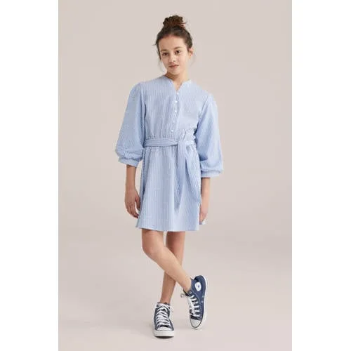 Speelse strepen en een luchtige pasvorm komen samen in deze WE Fashion jurk voor meisjes. De regular fit valt soepel om het lichaam en biedt genoeg bewegingsvrijheid om te rennen, spelen en draaien. De frisse blauwe kleur met streeppatroon geeft een moderne, verzorgde uitstraling die zowel op school als tijdens een familie-uitje past.Details die het verschil maken Gemaakt van 100% katoen voor een zachte, ademende feel op de huid V-hals en knoopsluiting aan de voorkant voor een nette, maar toch ontspannen look Ceintuur met knoopstrik om de taille naar wens te accentueren Ballonmouwen met halve lengte voor een speels silhouet Mouwboorden met knoopsluiting voor een verzorgde afwerking Korte jurk, ideaal voor warmere dagen of met een legging eronderComfortabel bij elke activiteitDeze jurk is ontworpen voor dagelijks gebruik. Het katoenen materiaal voelt prettig aan tijdens een actieve schooldag en blijft comfortabel wanneer je kind langer zit, bijvoorbeeld onderweg of tijdens een etentje. De ceintuur is eenvoudig te strikken, zodat de pasvorm makkelijk aan te passen is.WE Fashion, vertrouwd en eigentijdsWE Fashion staat bekend om toegankelijke, modieuze kleding voor het hele gezin. De ontwerpen sluiten aan op de laatste trends en houden tegelijk rekening met draagcomfort en praktische details. Zo kies je voor kleding waar je kind zich prettig in voelt en die er verzorgd uitziet.Deze jurk is geschikt voor alledaagse momenten en bijzondere gelegenheden.