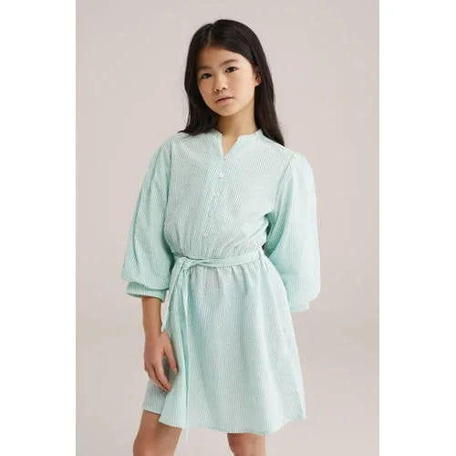 Fris, speels en toch comfortabel, deze WE Fashion jurk meisjes is ideaal voor allerlei gelegenheden. De mintgroene korte jurk heeft een regular fit en valt soepel om het lichaam. De verfijnde streepstructuur in de stof geeft een rustig patroon, terwijl de ballonmouwen en de V-hals zorgen voor een moderne uitstraling. Gemaakt van 100% katoen voelt de jurk zacht aan op de huid en is de jurk prettig om de hele dag te dragen.Verfijnde details voor elke dag Regular fit korte jurk voor een comfortabele pasvorm V-hals met doorlopende knoopsluiting aan de voorkant Halflange ballonmouwen voor een luchtig en speels effect Mouwboorden met knoopsluiting voor een nette afwerking Afneembare ceintuur met knoopstrik om de taille te accentueren Mintgroene kleur met subtiele streeptextuur Gemaakt van 100% katoen, prettig voor de gevoelige kinderhuidGemakkelijk combineren voor school en daarbuitenDeze jurk is geschikt voor schooldagen, feestjes of een dagje uit. Draag de ceintuur strak voor een meer gedefinieerde taille of juist losjes voor extra bewegingsvrijheid. In combinatie met sandalen, sneakers of een maillot past de jurk makkelijk mee met verschillende seizoenen.WE Fashion voor moderne kidsWE Fashion staat bekend om eigentijdse kleding die goed aansluit bij het dagelijkse leven van kinderen. De collecties combineren comfort met doordachte details, zodat elk item prettig zit en lang mooi blijft. Met deze jurk kies je voor een stijl die past bij actieve meiden en een merk dat let op pasvorm en kwaliteit.Een fijne jurk waarmee je kind zich verzorgd voelt, of het nu een gewone schooldag is of een speciale gelegenheid.