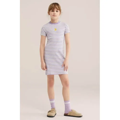 Fris, speels en klaar voor elke dag: deze gestreepte jurk voor meisjes is een fijne basic met een vrolijk detail. De jurk heeft een slim fit, een ronde hals en korte mouwen, waardoor hij mooi aansluit zonder strak aan te voelen. De horizontale strepen in paars/ecru geven een frisse look en het kleine fruitborduursel op de borst zorgt voor een subtiel accent.Details die het verschil maken Slim fit pasvorm die mooi aansluit op het lichaam Korte, rechte mouwen en een ronde hals voor een comfortabele basis Horizontale strepen in paars/ecru voor een frisse, moderne uitstraling Klein fruitborduursel op de borst als speels detail Gemaakt van 95% katoen / 5% elastaan, een zachte stof met fijne stretch Geen sluiting, je trekt de jurk eenvoudig over het hoofd aanElke dag draagbaarDeze jurk past goed in de dagelijkse garderobe. Ideaal voor school, een dagje weg of gewoon om in te spelen. In de zomer met sandalen of sneakers, op koelere dagen met een legging en vest erover. De soepele stof beweegt makkelijk mee, zodat er zorgeloos in gerend en geklommen kan worden.WE Fashion voor kidsWE Fashion ontwerpt kinderkleding die past bij een dynamische dag, met veel aandacht voor pasvorm en draaggemak. De collecties sluiten aan bij de laatste trends, maar blijven toch praktisch en gemakkelijk te combineren. Zo maak je met één item snel een complete, verzorgde outfit.Een fijne, gestreepte jurk waar ze zich de hele dag vrij en zelfverzekerd in kan bewegen.
