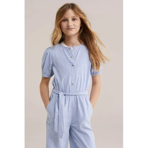 Geen zin in eindeloos combineren, maar wel een complete outfit in één keer klaar. Dan is deze lichtblauwe gestreepte jumpsuit voor meisjes een fijne keuze. Het model heeft een regular fit en valt soepel langs het lichaam. De subtiele verticale strepen geven een frisse, speelse uitstraling die perfect past bij schooldagen, speelafspraken of een dagje uit.Comfortabel en klaar om te gaan Korte pofmouwen met elastische boord voor een luchtig en toch netjes aangesloten effect Ronde hals en drukknoopsluiting boven, zodat de jumpsuit makkelijk aan en uit gaat Elastiek in de taille voor een comfortabele pasvorm die goed op zijn plek blijft Strikceintuur en riemlussen voor een mooie, verstelbare taille Rechte pijpen die lekker vrij vallen en genoeg bewegingsruimte geven Gemaakt van katoen met een soepele stof die zacht aanvoelt op de huidIdeaal voor dagelijks dragenDeze jumpsuit komt uit de daily collectie en is ontworpen voor schoolkinderen en tieners. Het model is zakloos, wat zorgt voor een rustige look en een fijne, lichte feel. Gewoon aantrekken met sneakers of sandalen en je kind is meteen klaar voor de dag.WE Fashion voor kidsWE Fashion ontwerpt kinderkleding die meegaat in het actieve leven van kinderen. De pasvormen zijn afgestemd op spelen, bewegen en ontdekken, met aandacht voor draagcomfort en een moderne uitstraling. Zo combineert WE Fashion praktische details met eigentijdse stijlen waar kinderen zelf ook blij van worden.Een makkelijke, complete outfit die het dagelijkse aankleden een stuk eenvoudiger maakt.