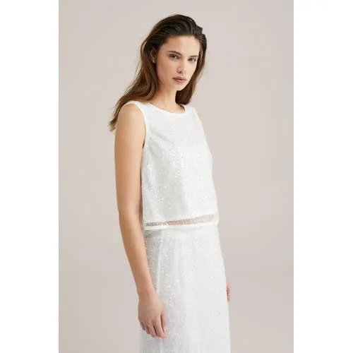 Een schitterende toevoeging aan je garderobe. Deze regular fit top met een transparante bovenlaag vol pailletten en kralen is een prachtige keuze. De mouwloze pasvorm en de elegante knoopsluiting maken het zowel stijlvol als comfortabel.