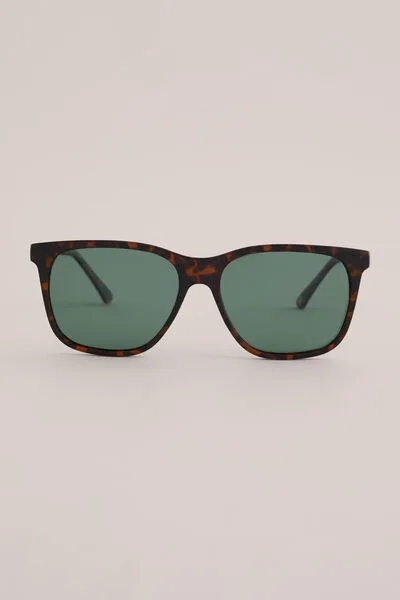 Een veilige keuze voor elke zonnige dag. Deze zonnebril heeft een bruin-gevlekt rechthoekig frame, groene glazen, half metalen pootjes, UVA/UVB-bescherming en een microfiber hoesje. Laat de zon maar komen.