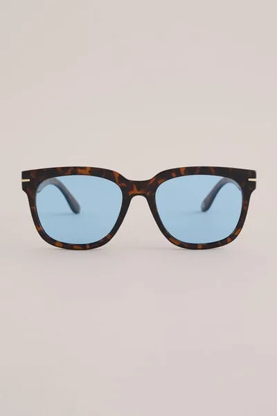 Voor wie graag incognito blijft in de supermarkt. Deze zonnebril heeft een rechthoekig frame, UVA/UVB-bescherming en een microfiber hoesje, in bruin-gevlekt met blauw glas of mat zwart met groen glas. Zo loop je sneller langs de komkommers.