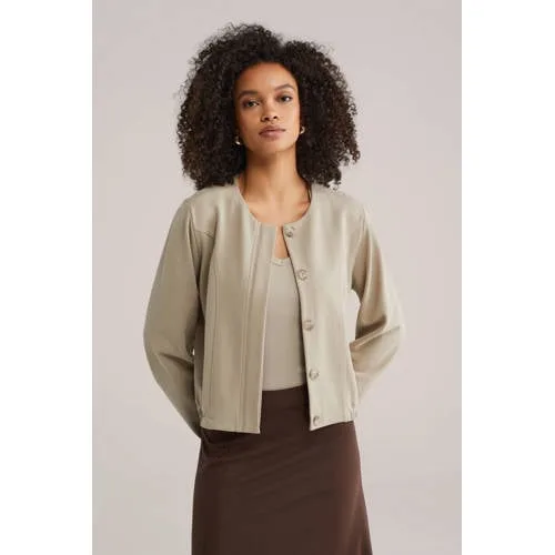 Maak je outfit compleet met dit WE Fashion bomberjack dames in beige. Het jasje heeft een regular fit die recht valt en een ontspannen uitstraling geeft. De soepele jersey stof voelt prettig aan en beweegt makkelijk met je mee. Dankzij de ronde hals en de knoopsluiting oogt het bomberjack verzorgd en toch casual, waardoor het zowel naar kantoor als in het weekend goed te dragen is.Comfortabele details voor elke dag Regular fit voor een relaxed silhouet dat niet te strak valt Gemaakt van zachte jersey stof voor een comfortabel draaggevoel Elastische boorden aan onderkant en mouwen voor een mooie aansluiting Ronde hals en knopen aan de voorkant voor een rustige, stijlvolle look Lange mouwen, geschikt voor het lente seizoen en frissere dagen In beige, een neutrale kleur die in veel situaties passend is Ontworpen als licht jasje, zonder zakken voor een strak en clean ontwerpEen licht jasje voor het hele seizoenDit bomberjack is een praktische extra laag voor lentedagen of koele zomeravonden en kan zowel open als gesloten worden gedragen.WE Fashion, eigentijdse stijlWE Fashion staat bekend om moderne kleding met een heldere pasvorm en toegankelijke stijl. De collecties worden ontworpen zodat items eenvoudig met elkaar te combineren zijn, zodat je met een paar basics steeds nieuwe looks samenstelt.Een veelzijdig jasje dat past bij uiteenlopende momenten op de dag.