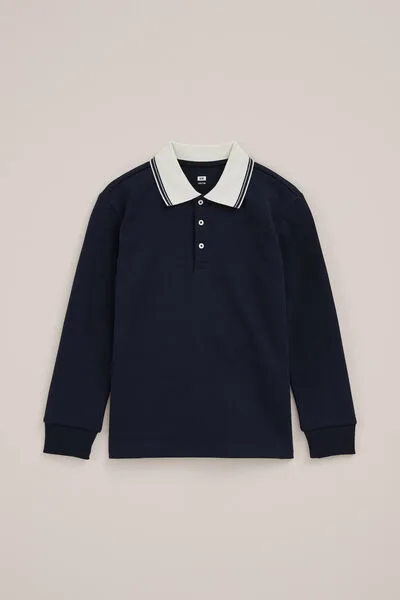 Netjes zonder stijf gedoe. Deze polo heeft lange mouwen, een witte kraag, drieknoopsluiting en ribboorden. Perfect voor als opa komt eten, maar ook geschikt voor een potje voetbal na schooltijd.