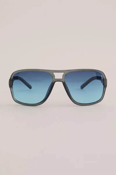 Alsof je onderweg bent naar een geheime missie. Deze zonnebril heeft een mat donkergrijs pilotenframe met blauwe glazen, UVA/UVB-protectie en een microfiber hoesje. Niet alleen praktisch, maar staat ook stoer.