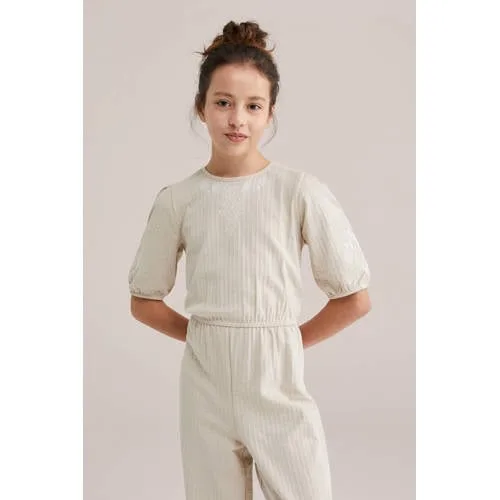 Luchtig, speels en klaar voor elke dag, deze WE Fashion seersucker jumpsuit voor meisjes is een fijne basis voor warme dagen en actieve momenten. De jumpsuit is gemaakt van 100% katoen met een licht kreukelige seersucker structuur, waardoor de stof luchtig om het lichaam valt. De beige kleur maakt combineren eenvoudig en laat de subtiele details mooi uitkomen.Speelse details in een comfortabel ontwerp Gemaakt van 100% katoen in seersucker kwaliteit, voelt licht en luchtig aan op de huid. Regular fit met rechte pijpen voor een ontspannen pasvorm. Lange rechte mouwen met elastische boord voor een aansluitende, maar comfortabele look. Elastiek in de taille zorgt voor een mooie vorm en extra draaggemak. Ruitvormige borduursels op borst en mouwen voor een speels, verfijnd detail. Knoopsluiting maakt aan- en uittrekken eenvoudig. Effen beige kleur, makkelijk te combineren met sandalen, sneakers of een vestje. Zonder zakken, waardoor het silhouet rustig en strak blijft.Ideaal voor schooldagen en vrije tijdDeze jumpsuit is een praktische keuze voor dagen waarop alles in beweging is. De soepele katoenen stof biedt veel bewegingsvrijheid, terwijl de elastische taille en boorden alles netjes op zijn plek houden. Met één kledingstuk is de outfit meteen compleet, alleen nog schoenen en klaar.WE Fashion, vertrouwde stijl voor kidsWE Fashion staat bekend om toegankelijke mode met aandacht voor pasvorm en draaggemak. De kindercollecties zijn ontworpen voor dagelijks gebruik, waarbij comfort en moderne details samenkomen. Zo kies je een jumpsuit waar zowel kind als ouder blij van wordt.Een luchtige, comfortabele jumpsuit die er elke dag verzorgd uitziet zonder moeite.
