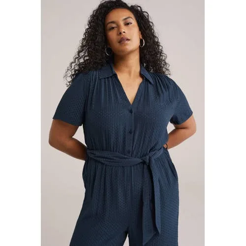 Ga voor een moeiteloze outfit met deze blauwe dames jumpsuit van WE Fashion. Het soepele model heeft een regular fit en valt losjes om het lichaam, waardoor je een ontspannen maar verzorgde uitstraling krijgt. De klassieke kraag met V-hals en knoopsluiting geeft een nette look, terwijl de korte mouwen en rechte pijpen ideaal zijn voor warmere dagen. De all-over structuur van fijn gestikte stippen zorgt voor een subtiel, speels effect in de stof.Comfortabele pasvorm met doordachte details Regular fit met rechte pijpen voor een ontspannen silhouet Elastische taille met strikceintuur om de taille naar wens te accentueren Klassieke kraag en V-hals met knoopsluiting voor een nette uitstraling Korte mouwen en soepele stof, prettig op de huid Zijzakken voor praktisch gemak in je dagelijkse look All-over fijn gestikte stippenstructuur voor een subtiel dessin Onderdeel van het grote maten assortiment, ontworpen voor een comfortabele pasvormVoor dagelijkse momenten, van werk tot weekendDeze jumpsuit komt goed tot zijn recht in je dagelijkse garderobe. Draag het model met sneakers voor een relaxte dag of met nette sandalen voor een meer geklede look. De elastische taille en soepele stof maken het een fijne keuze voor lange dagen waarop je je vrij wilt bewegen.WE Fashion, herkenbare stijl voor elke dagWE Fashion staat bekend om moderne collecties met herkenbare, draagbare items voor alledag. De pasvorm en details worden zorgvuldig uitgewerkt, zodat je kledingkast gevuld is met stukken waar je vaak naar grijpt. Met deze jumpsuit voeg je een veelzijdig item toe dat je eenvoudig combineert.Een comfortabele one-piece die je dagelijkse outfits rustig, verzorgd en compleet maakt.