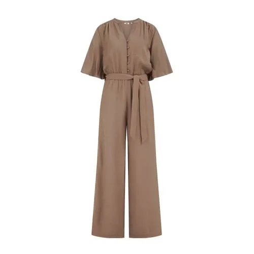 De WE Fashion Leslie jumpsuit in bruin is een praktische basis voor dagen waarop je met één kledingstuk meteen klaar wilt zijn. De effen kleur zorgt voor een rustige look, terwijl de V-hals en half lange mouwen een elegante lijn creëren. Door de ceintuur in de taille kun je het silhouet naar wens laten aansluiten op jouw figuur.Details die je elke dag draagt Effen bruine jumpsuit, goed te combineren met sneakers, sandalen of laarsjes Halflange, rechte mouwen voor net wat meer bedekking V-hals en knoopsluiting aan de voorkant voor een nette uitstraling Ceintuur in de taille om de pasvorm strakker of losser te maken Gemaakt van een soepele stof met viscose voor een zachte touch Geen zakken, waardoor de pasvorm rondom de heupen strak en glad blijftGeschikt voor jouw dagelijkse momentenDeze jumpsuit past goed bij de lente en bij dagen waarop je weinig tijd hebt om na te denken over je outfit. Draag er overdag een lichte cardigan bij en wissel voor de avond eenvoudig naar een blazer en hakken. Zo ga je makkelijk van casual naar een meer geklede stijl.WE Fashion als vertrouwde keuzeWE Fashion staat voor toegankelijke mode voor elke dag, met aandacht voor pasvorm en draaggemak. De collecties sluiten aan op het leven van nu, met items die je vaak en op verschillende manieren kunt dragen.Met deze jumpsuit haal je een kledingstuk in huis dat het hele seizoen door goed van pas komt.