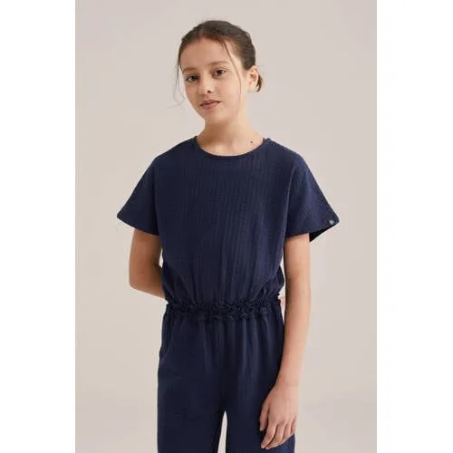 Deze donkerblauwe WE Fashion jumpsuit voor meisjes is een luchtige en makkelijke basis voor warme dagen. Het model heeft een regular fit met rechte pijpen, waardoor het soepel valt en genoeg bewegingsruimte biedt om te rennen en te spelen. De ronde hals en korte mouwen geven een rustige uitstraling, terwijl de all over kleurrijke print zorgt voor een speels geheel. Gemaakt van 100% katoen voelt de jumpsuit zacht en ademend aan op de huid.Comfortabele details voor elke dag Gemaakt van 100% katoen, wat prettig aanvoelt en fijn draagt bij hogere temperaturen Elastiek in de taille met ruches voor een veilige, maar niet knellende pasvorm Regular fit met rechte pijpen voor comfortabele bewegingsvrijheid Subtiele textuur en ruches als rustig detail voor een verzorgde look Enkele knoopsluiting op de rug om de jumpsuit eenvoudig aan en uit te trekken Donkerblauwe kleur met kleurrijke print die makkelijk te combineren is met slippers, sandalen of sneakersMakkelijke outfit voor school en vrije tijdDeze jumpsuit is ideaal als snelle one-piece outfit. Een T-shirt of hemdje eronder is niet nodig, een paar favoriete schoenen erbij en je kind is direct klaar voor school, een feestje of een dagje weg.WE Fashion voor het hele gezinWE Fashion staat bekend om toegankelijke kleding met een moderne uitstraling voor jong en oud. De ontwerpen sluiten aan op het dagelijkse gezinsleven, met aandacht voor draagcomfort, pasvorm en zorgvuldig gekozen details.Een praktische, luchtige jumpsuit die elke zomerse dag net wat makkelijker en leuker maakt.