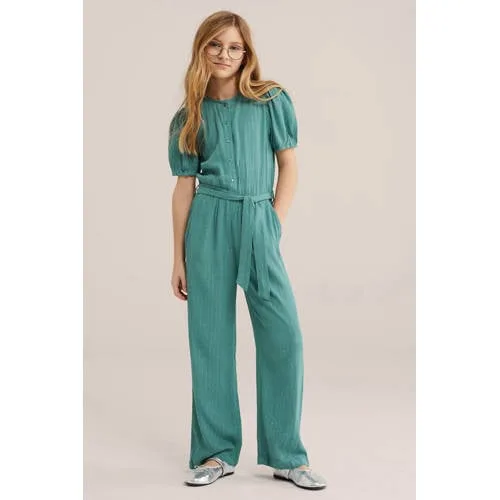 Voor een speelse look in één keer zit je met deze mintgroene jumpsuit voor meisjes goed. De zachte kleur, subtiele glitterstrepen en het comfortabele model zorgen samen voor een outfit die er verzorgd uitziet en tegelijkertijd prettig aanvoelt. Korte pofmouwen, een ronde hals en rechte pijpen geven de jumpsuit een rustige, moderne uitstraling die makkelijk te stylen is.Handige details voor elke dag Korte pofmouwen en ronde hals voor een luchtige, kindvriendelijke pasvorm Elastische taille voor een rechtvallend silhouet dat toch mooi aansluit Rechte pijpen voor een ontspannen model Drukknoopsluiting aan de bovenkant voor snel aan- en uittrekken Elastische boorden bij de mouwen voor extra comfort Zakken aan de voorkant, handig voor kleine spulletjes Riemlussen zodat er gemakkelijk een ceintuur aan toegevoegd kan worden Zachte, soepele stof die prettig meebeweegt Effen mintgroene basis met glitterstrepen voor een subtiele glansFijn om te dragen naar school of in het weekendDeze jumpsuit is geschikt voor schooldagen, speelafspraken en familiebezoek. De elastische taille en rechte pijpen geven genoeg bewegingsvrijheid om te rennen en spelen, terwijl de drukknopen het omkleden eenvoudig maken. Een paar sneakers of sandalen eronder en de outfit is compleet.WE Fashion voor kidsWE Fashion staat bekend om moderne collecties voor het hele gezin, met aandacht voor pasvorm en draaggemak. De kinderkleding is ontworpen voor dagelijks gebruik, met praktische details en materialen die prettig aanvoelen. Zo combineert WE Fashion eigentijdse stijl met kleding waar kinderen zich vrij in kunnen bewegen.Een comfortabele jumpsuit die elke doordeweekse dag verzorgd aankleedt.