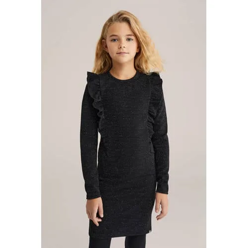 Deze jurk van WE Fashion heeft lange mouwen en een ronde hals. De jurk is zwart en gemaakt van polyester met lurex en elastaan. Met glitters, ruches, rechte mouwen en een korte lengte.