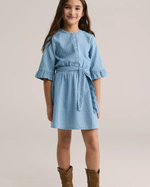 Deze WE Fashion denim jurk voor meisjes vormt een praktische basis voor elke dag. De regular fit valt comfortabel rond het lichaam en de elastische tailleband met strikceintuur zorgt voor een speelse belijning. De jurk is gemaakt van 100% katoen, waardoor de stof zacht aanvoelt en prettig is om te dragen tijdens warme dagen. De combinatie van korte lengte en denim look geeft een casual uitstraling die makkelijk te combineren is met sneakers, sandalen of laarsjes.Details die het verschil maken Regular fit met elastische tailleband voor een comfortabele pasvorm Strikceintuur in de taille voor extra accent en variatie Korte mouwen met ruches voor een speels effect Knoopsluiting op het bovenstuk, handig bij het aan- en uittrekken Ronde hals die netjes aansluit bij de halslijn Korte jurk, ideaal voor lente en zomer Gemaakt van 100% katoen voor een luchtig en ademend gevoel Zonder zakken voor een eenvoudig, egaal vooraanzichtEenvoudig te stylen, het hele seizoen doorDeze denim jurk past bij veel momenten op de dag. Met blote benen en sandalen is de jurk geschikt voor warme dagen, met een legging of maillot en een vest kan de jurk ook mee de frissere seizoenen in.WE Fashion: moderne basics voor elke dagWE Fashion staat voor eigentijdse kleding met draagbare fits en heldere ontwerpen. De collecties zijn afgestemd op het dagelijkse leven, met stukken die onderling goed te combineren zijn en lang in de kast meegaan.Een denim jurk waar gemakkelijk naar wordt gegrepen bij het aankleden.