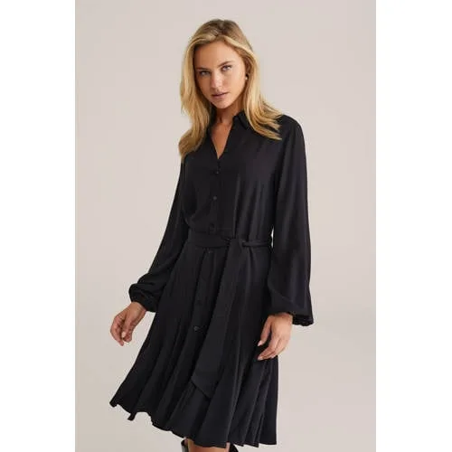 Deze WE Fashion jurk heeft lange mouwen en een klassieke kraag. De jurk is gemaakt van viscose en heeft een knoopsluiting, ceintuur, plooien en riemlussen. De lengte is kort.