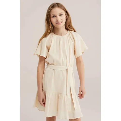 Voor zonnige dagen en speelafspraken is deze korte meisjes jurk van katoen een praktische basis in de kledingkast. De jurk heeft een regular fit, een ronde, elastische hals en korte vlindermouwen die soepel om de armen vallen. De lichte beige kleur maakt het een rustig item dat makkelijk combineert met sandalen, sneakers of een vestje op koelere dagen.Luchtig model met speelse details Gemaakt van 100% katoen, voelt zacht aan op de huid Korte jurk met twee lagen voor een zwierig effect Korte vlindermouwen voor extra bewegingsvrijheid Elastische, ronde hals waardoor de jurk eenvoudig aan en uit gaat Strikceintuur in de taille voor een verstelbare pasvorm Effen beige kleur, makkelijk te combineren Fijne kreukelstructuur met stretch voor een speelse look Geen sluiting en geen zakken voor een glad, comfortabel silhouetVoor elke dag van peuter tot tienerDeze jurk komt uit de Daily collectie en is geschikt voor peuters, kleuters, schoolkinderen en tieners. Ideaal voor school, een logeerpartij of een dagje weg. Het luchtige model volgt alle bewegingen en blijft tegelijkertijd netjes zitten dankzij de elastische hals en ceintuur.WE Fashion voor kinderenWE Fashion staat voor moderne, draagbare kinderkleding met een duidelijke pasvorm en prettige materialen. De collecties sluiten aan op het dagelijks leven, met ontwerpen die er verzorgd uitzien en waarin kinderen makkelijk kunnen bewegen en spelen.Een praktische, zwierige jurk met veel bewegingsvrijheid voor de hele dag.