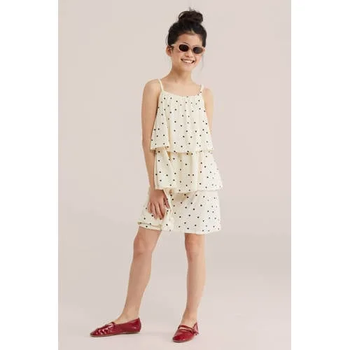 Speels, licht en klaar voor elke dag, deze meisjes jurk met stippen is een fijne keuze voor warme dagen. De beige jurk met zwarte stippen heeft een vierkante hals en verstelbare bandjes, zodat de pasvorm eenvoudig aangepast kan worden. Door de luchtige stof en de lagen die over elkaar vallen, ontstaat een zwierig silhouet dat prettig meebeweegt.Fris ontwerp met speelse lagen Mouwloos model, ideaal voor zomerse dagen of om te combineren met een vestje Vierkante hals voor een moderne, open halslijn Verstelbare bandjes voor een betere pasvorm, van peuter tot tiener Gemaakt van 100% viscose, een soepele stof die zacht aanvoelt Speelse lagen met plooien die zorgen voor extra volume en beweging Geen sluiting, de jurk trek je eenvoudig over het hoofd aan Beige/zwart print met stippen, makkelijk te combineren met sandalen of sneakersElke dag draagbaarDeze korte jurk uit de daily collectie is geschikt voor schooldagen, een verjaardag of een dagje weg. Met een T-shirt eronder en een spijkerjasje erboven kan de jurk ook op frissere dagen gewoon door gedragen worden.WE Fashion voor kidsWE Fashion ontwerpt kinderkleding met aandacht voor pasvorm, zachte materialen en draaggemak. De collecties sluiten aan bij het dagelijks leven van kinderen, met modellen die goed combineren en lang favoriet blijven.Een luchtige jurk waar makkelijk in bewogen kan worden en die er tegelijk verzorgd uitziet.