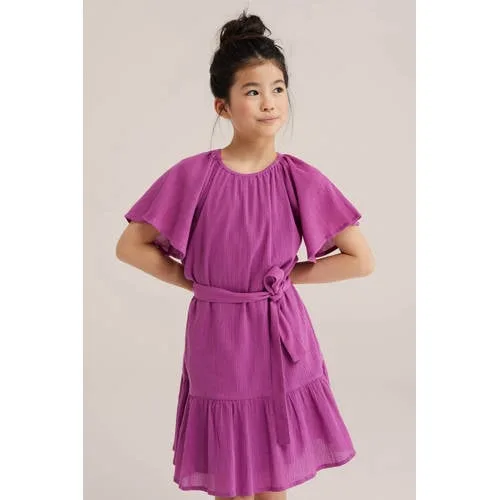 Speels, luchtig en comfortabel, deze paarse meisjes jurk van WE Fashion is een praktische toevoeging aan de kledingkast. De jurk heeft een regular fit, een ronde, elastische hals en korte vlindermouwen die soepel meebewegen. De dubbele laag en de fijne kreukelstructuur met stretch geven een levendig effect, zonder dat het te druk wordt. Gemaakt van 100% katoen voelt de stof zacht aan en is hij prettig om de hele dag te dragen.Luchtig model met speelse details Regular fit met ronde, elastische hals voor gemakkelijk aan- en uittrekken Korte vlindermouwen voor een zachte, sierlijke uitstraling Strikceintuur in de taille voor een verstelbare, comfortabele pasvorm Twee lagen stof voor een mooi vallend silhouet Fijne kreukelstructuur met stretch voor een speels en soepel effect Gemaakt van 100% katoen, zacht en prettig om te dragen Effen paarse kleur, goed te combineren met vestjes en sneakersVoor alledaagse momenten en extra leuke dagenDeze jurk uit de Daily collectie is geschikt voor schooldagen, een feestje of een dagje weg. Combineer met sandalen of gympen en eventueel een vest bij frissere temperaturen. De elastische hals en het ontbreken van een sluiting maken aankleden eenvoudig.WE Fashion voor kidsWE Fashion ontwerpt kinderkleding die er verzorgd uitziet en tegelijk praktisch is voor elke dag. Met aandacht voor pasvorm, draagcomfort en doordachte details sluit deze jurk goed aan bij een actief kinderleven.Een veelzijdige jurk waar je kind zich vrij in kan bewegen.