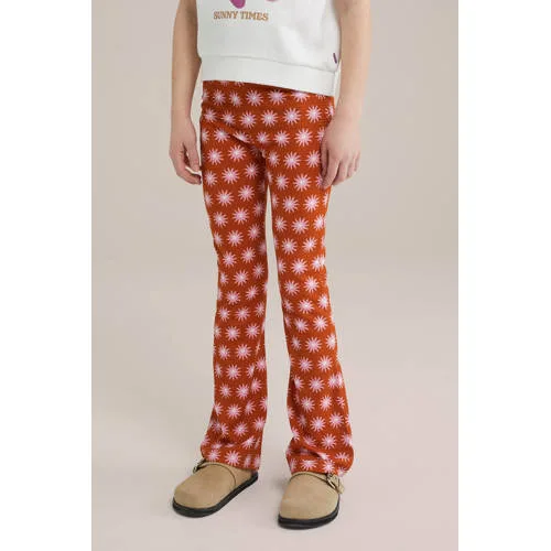 Deze flared meisjesbroek van WE Fashion heeft een elastische tailleband. Gemaakt van polyester en elastaan, in een roodbruine kleur met roze en witte details. Perfect voor comfort en stijl.