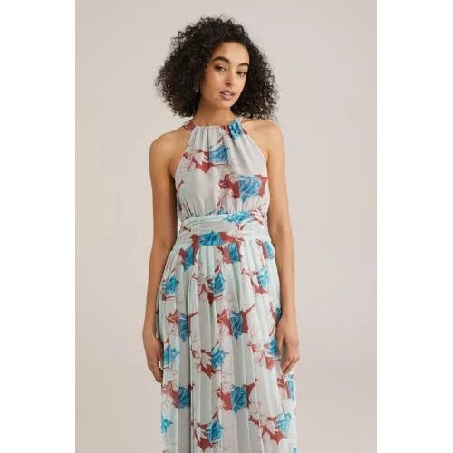 Ga voor een onvergetelijke zomerlook! Deze mouwloze maxi-jurk heeft een subtiel dessin, een ronde halterkraag en een brede tailleband die je figuur perfect accentueert. Het elegante onderstuk is voorzien van brede plisséplooien en een comfortabele onderrok. Verder heeft de jurk aan de rugzijde een ritssluiting die in de nek uitloopt op een knoopssluiting.