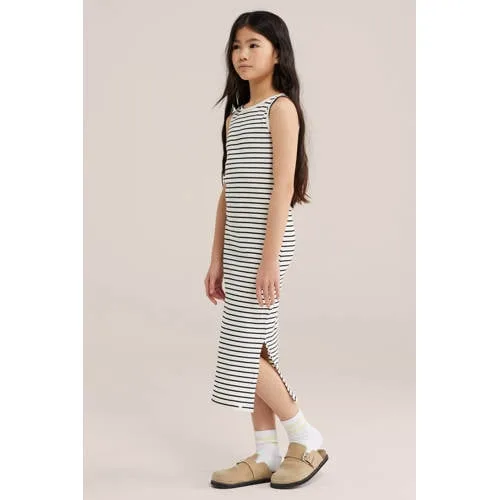 Deze ribgebreide maxi jurk voor meisjes is gemaakt voor zorgeloze dagen vol beweging. De lange, mouwloze jurk heeft een aansluitende pasvorm en een ronde hals, waardoor de jurk er netjes uitziet en toch heel comfortabel zit. De zachte ribstof in wit/zwart rekt soepel mee dankzij het elastaan, zodat rennen, fietsen en buitenspelen geen probleem is. De zijsplitten aan de onderkant geven extra ruimte bij elke stap.Praktische details voor elke dag Lange jurk met bodycon pasvorm voor een moderne, slanke look Mouwloos ontwerp met ronde hals, ideaal voor warme dagen of met een vestje erover Gemaakt van 95% katoen / 5% elastaan voor een zachte touch en comfortabele stretch Rib gebreide structuur die mooi aansluit en lang in vorm blijft Zijsplitten zorgen voor meer bewegingsvrijheid tijdens spelen en sporten Effen dessin in wit/zwart, makkelijk te combineren met sneakers of sandalen Geen sluiting, gewoon over het hoofd aantrekken en klaarIdeaal voor buitenspelen en schooldagenDeze jurk komt uit de daily collectie en past bij peuter, kleuter, schoolkind en tiener. Even aantrekken en direct de deur uit, zonder nadenken over combinaties. Met een T-shirt eronder of een hoodie erover maak je de outfit eenvoudig warmer op frisse dagen.WE Fashion voor kidsWE Fashion staat bekend om kinderkleding die er verzorgd uitziet en tegelijkertijd praktisch is in het dagelijks leven. De ontwerpen sluiten aan bij de laatste trends, maar blijven draagbaar voor school, speelafspraakjes en familiebezoek. Zo kies je voor kleding waar je kind zich vrij in kan bewegen en die gemakkelijk te stylen is.Een praktische basisjurk waar je kind de hele dag onbezorgd in kan spelen en bewegen.