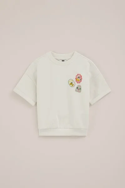 Voor dagen waarop ze liever geen jas aantrekt, maar wel iets warms wil. Deze sweater heeft een oversized pasvorm met ronde hals en ribboord. De korte mouwen met omslag en de prints op de borst en rug maken ’m net wat eigenwijzer.