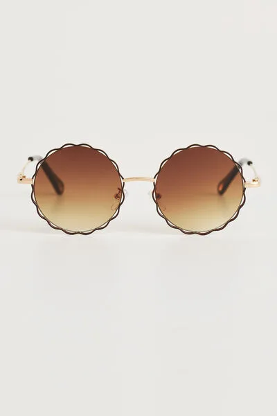Een UV-bestendige zonnebril van metaal met gekleurde glazen.