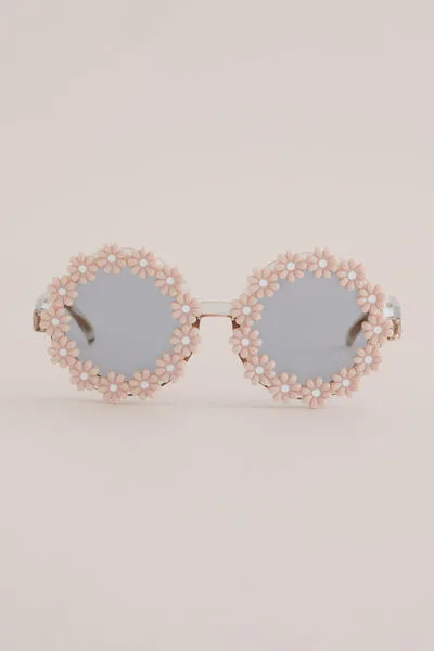 Voor kleine liefhebbers van veel detail. Deze zonnebril heeft lichtgrijze ronde glazen met bloemrand, transparant roze pootjes, UVA/UVB-bescherming en een microfiber hoesje. Zo zie je de wereld echt een beetje door een roze bril.