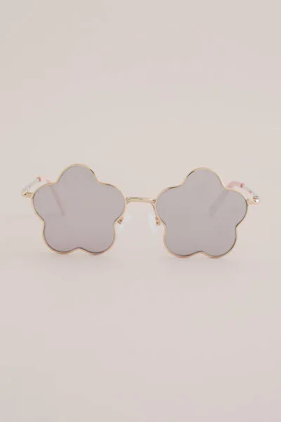 Flowerpower! Deze zonnebril heeft een roségoud metalen montuur, bloemvormige roze spiegelglazen, rubberen uiteinden, UVA/UVB-bescherming en een microfiber hoesje. Grote kans dat onbekenden vragen waar je ‘m vandaan hebt.